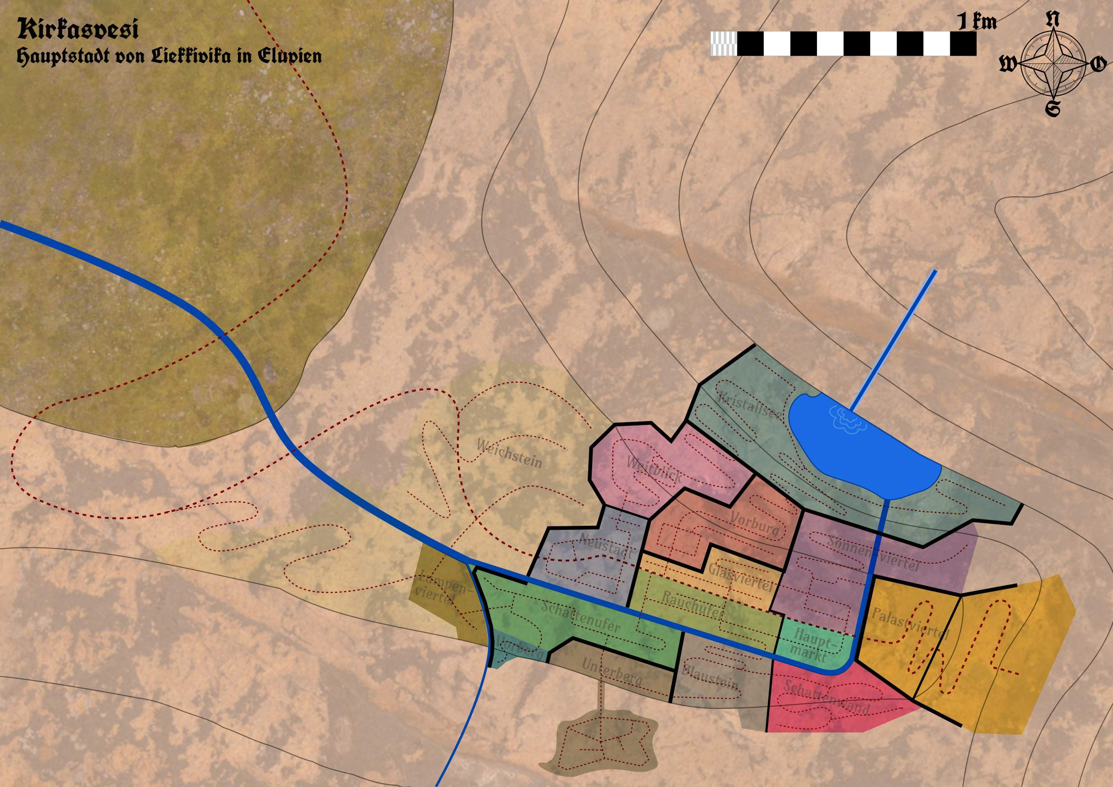 Die Stadt Kirkasvesi („Leuchtwasser“) wird oft auch „Gildenstadt“ genannt, denn vor den Toren der Stadt befindet sich das Zentrum des mächtigen Konvents des Endlosen Flusses der Magier, die Eluvien gemeinsam mit den Clanslords beherrschen, die Zentraluniversität zu Kirkasvesi. So darf es nicht verwundern, dass in der reichen, prächtigen Hauptstadt des Clanslands Liekkivika fast 6.000 Mitglieder der Magiergilde wohnen, also mehr als die 4.000 „normalen“ Bürger, die sich beruflich weitgehend auf die Versorgung der Magier, ihrer Sucher und ihrer Gäste eingestellt haben.